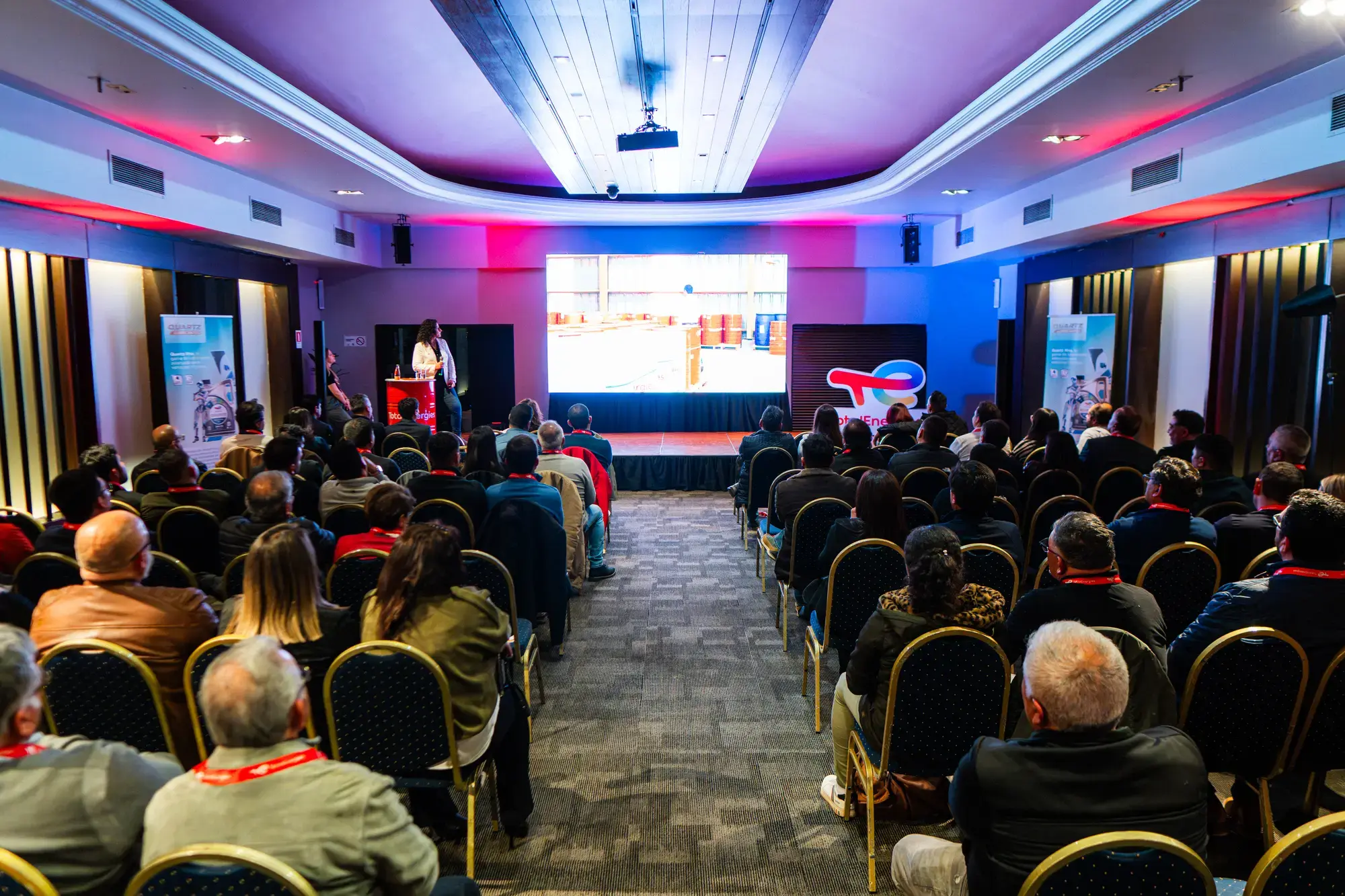 Felipe Valdivia, Gerente Técnico de TotalEnergies, ofreció una presentación sobre los nuevos lanzamientos de productos y las últimas tendencias en lubricación, destacando el liderazgo técnico de la marca y sus soluciones para optimizar rendimiento y reducir emisiones.